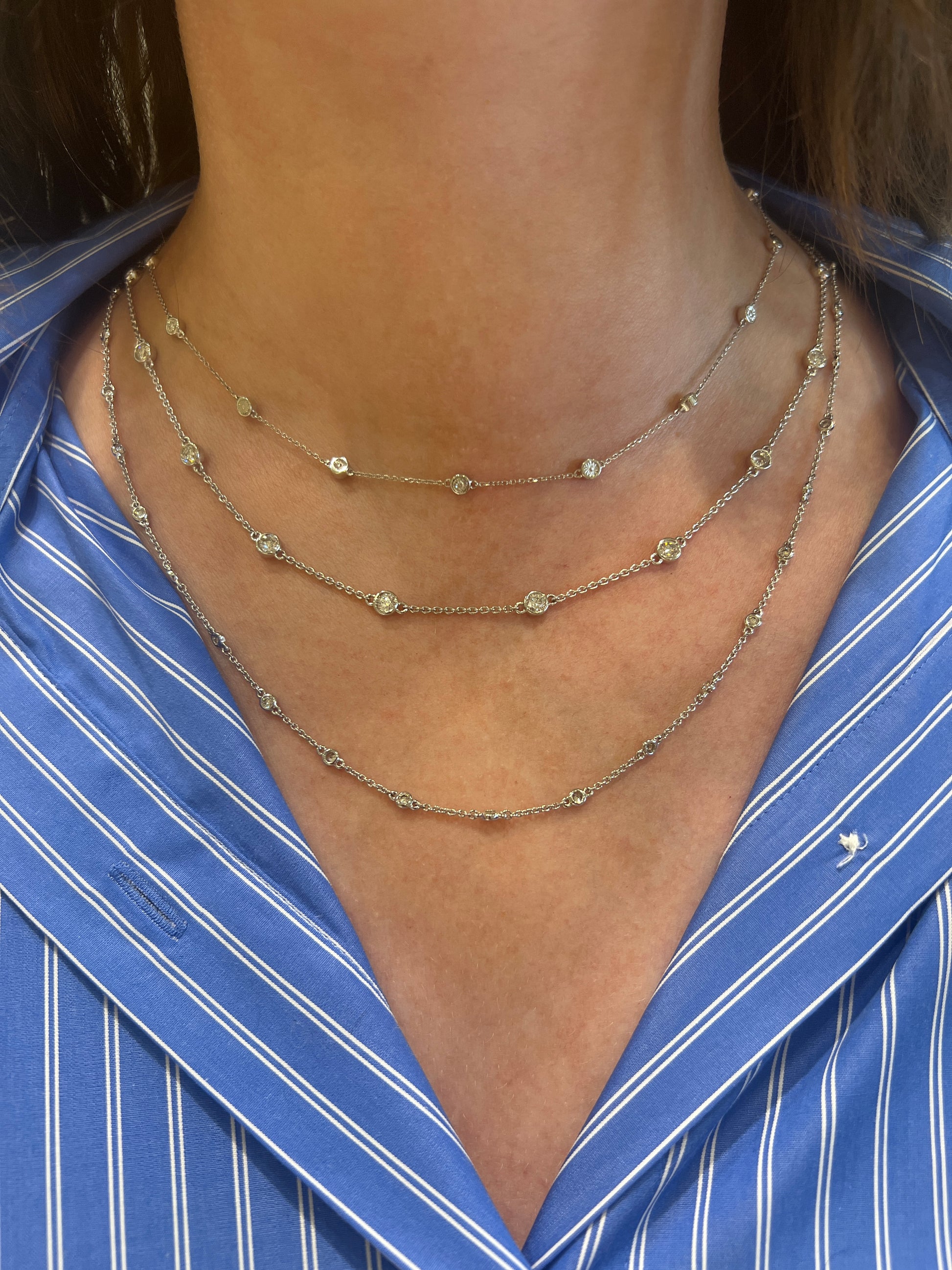 14K WHITE GOLD DIAMOND BY THE YARD NECKLACE CONTAINING ROUND BRILLIANT CUT NATURAL EARTH MINED DIAMONDS TOTALING 2.49 CTTW 18". THIS NECKLACE IS FEATURED AS THE MIDDLE NECKLACE IN THE STYLE SHOT BELOW.