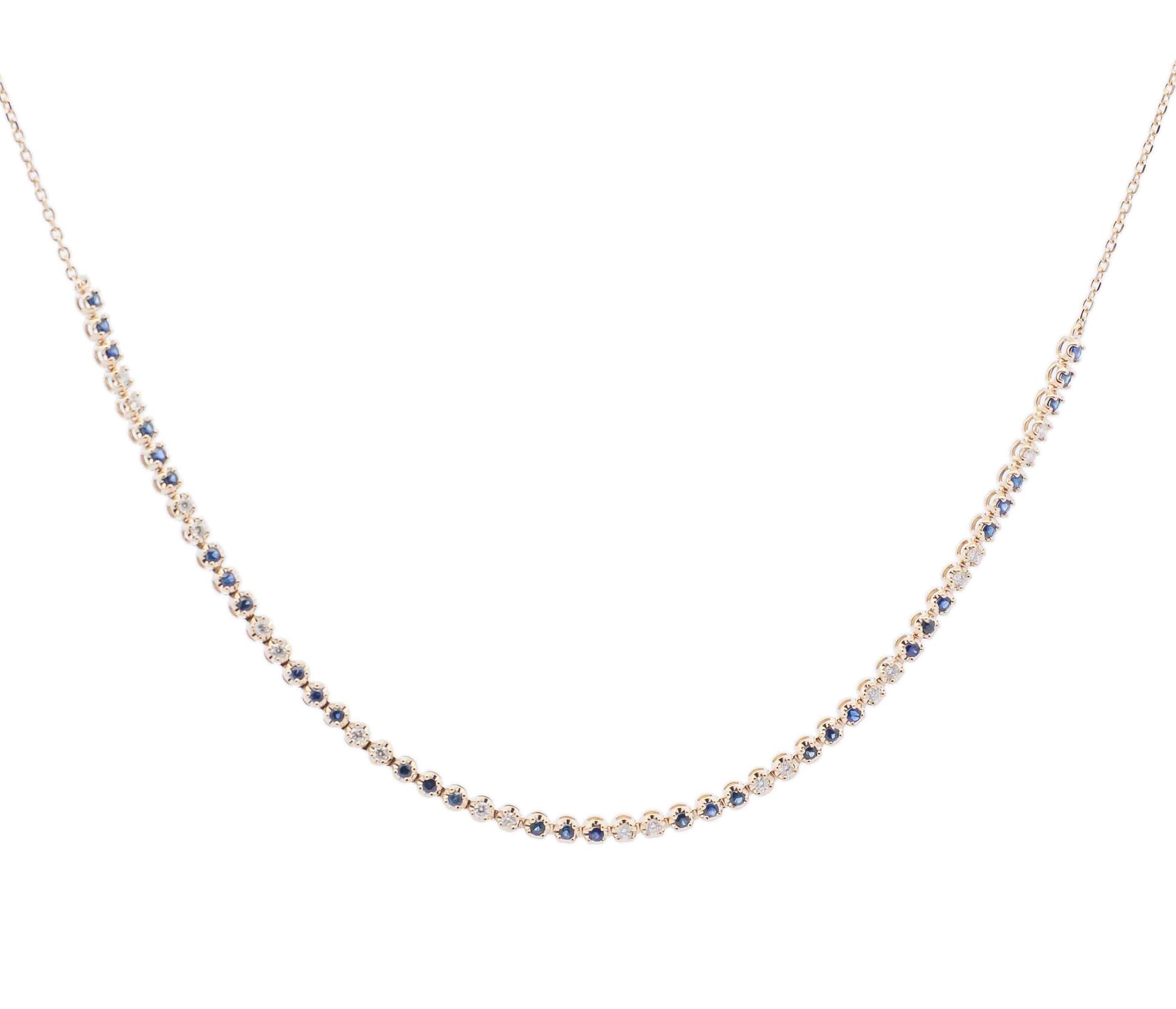 14K YELLOW GOLD DIAMOND AND BLUE SAPPHIRE LINE NECKLACE CONTAINING ROUND BRILLIANT CUT NATURAL EARTH MINED DIAMONDS TOTALING 0.35 CTTW AND ROUND BLUE SAPPHIRES TOTALING 0.78 CTTW 18" CHAIN WITH JUMP RINGS AT 16" AND 17"