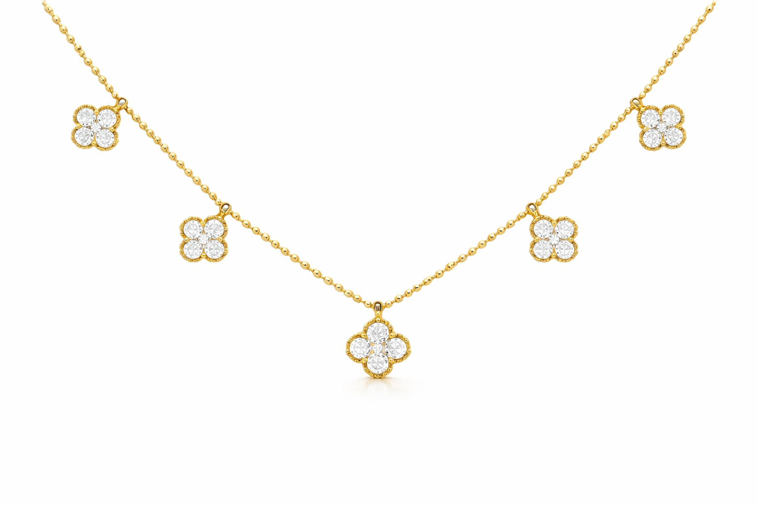 14K YELLOW GOLD DIAMOND BEADED CLOVER STATION NECKLACE CONTAINING 35 ROUND BRILLIANT CUT DIAMONDS TOTALING 1.06CTW 16"