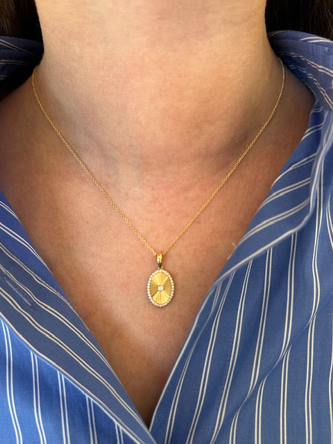 18KY FLUTED OVAL PENDANT CONTAINING 35 NATURAL EARTH MINED ROUND BRILLIANT CUT DIAMONDS TOTALING .17 CTTW SUSPENDED 18" CHAIN WITH LOBSTER CLASP