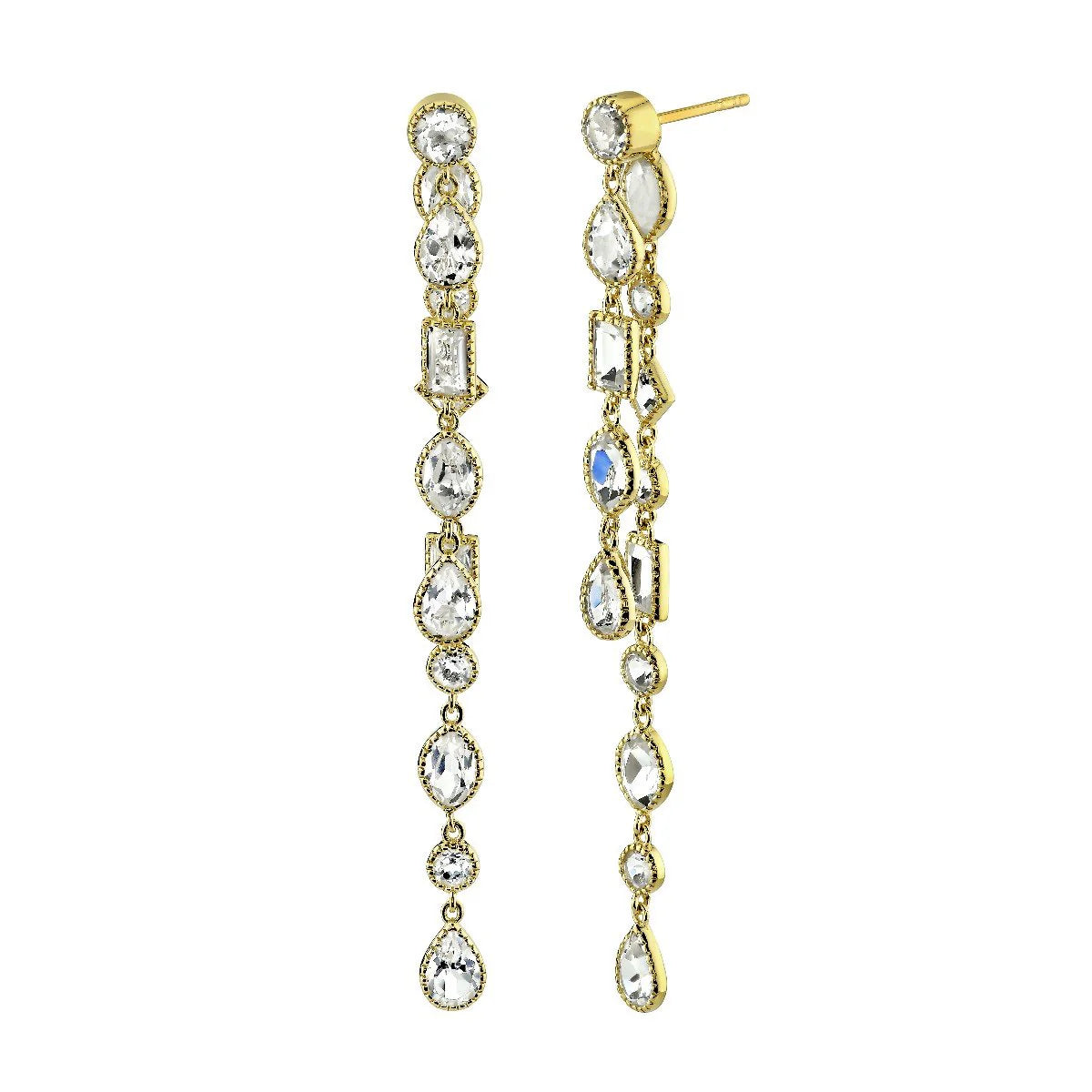 SLOANE STREET MIX SHAPE DOUBLE DROP EARRINGS WITH 28 WHITE TOPAZ TOTALING 9.16 CTTW SET IN 18K YELLOW GOLD. DETACHABLE BACK SO YOU HAVE THE OPTION TO WEAR ONLY THE FRONT DROP.